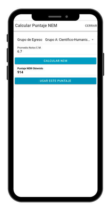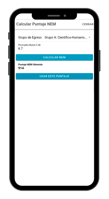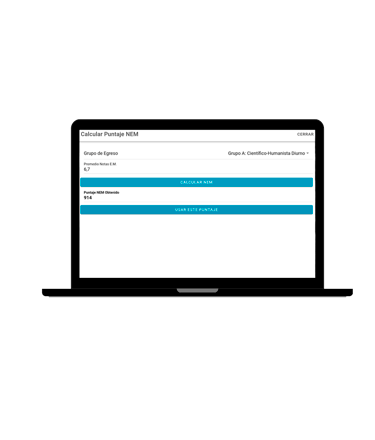 Con nuestra Calculadora NEM puedes estimar tu puntaje final de manera rápida y sencilla. Solo necesitas ingresar tu promedio de notas de enseñanza media y la herramienta hará el cálculo automáticamente, mostrándote cómo impacta tu NEM en tus posibilidades de ingreso a la carrera que deseas. Es la manera más fácil de planificar tu futuro académico y tomar decisiones informadas.